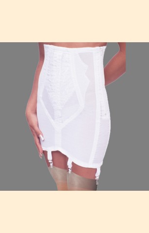 Корсетный пояс для чулок очень сильной степени коррекции с завышенной талией. Данная модель позволяет отлично сформировать фигуру за счет комбинации нейлоновой и сатиновой тканей, которые скроены таким образом, что убирают лишние сантиметры, не создавая чувства дискомфорта при использовании. Усиленная вставка на передней панели корректирует живот, а специальные косточки вместе с особым кроем формируют линию талии и боков. Для удобства надевания и использования имеется застежка-молния, которая изнутри дублируется крючками. Имеется 6 металлических застежек для чулок.