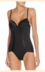 Боди сильной степени коррекции с формованной чашкой на регулируемых бретелях, спереди дополнительная вставка для более качественной коррекции области живота по всей длине изделия. Боди украшено вертикальными атласными вставками, которые зрительно "стройнят и вытягивают" фигуру. Застежка внизу изделия на крючках в три ряда, что позволяет регулировать изделие в зависимости от роста. Ластовица из хлопка.